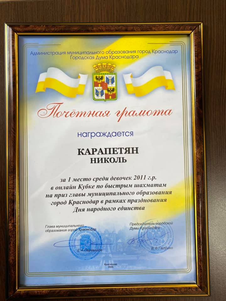 Копия Награждение воспитанницы ДЮСШ Карапетян Николь, занявшей I место в онлайн Кубке по шахматам